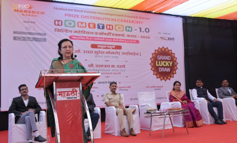 मलकापूर (कराड) येथे 23 ते 27 जानेवारी दरम्यान नरेडको (NAREDCO) संस्थेच्या वतीने आयोजित भव्य ‘होमथॉन 1.0’ प्रॉपर्टी व बिल्डिंग मटेरियल एक्स्पोच्या सांगता सोहळ्यात त्या प्रमुख पाहुण्या म्हणून बोलत होत्या. कार्यक्रमाच्या अध्यक्षस्थानी कराड शहर पोलीस ठाण्याचे पोलीस निरीक्षक दत्तात्रय दराडे होते. यावेळी नरेडकोचे संस्थापक अध्यक्ष अरविंद खबाले, उपाध्यक्ष सुभाष लोंढे, सौ. शर्मिष्ठा खबाले, व्हिजन डेव्हलपर्सचे प्रशांत चव्हाण, प्रवीण पाटील यांच्यासह मान्यवरांची उपस्थिती होती.